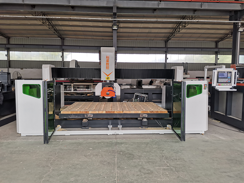 3220 Five Axis Bridge Stone Cutting Machine. This stone cnc with a machine head that can freely swing 360 degrees and cut the board at any angle and shape. The workbench is flipped 85 degrees for easy loading and unloading. Easy to operate, the control system can input data. Adopting a five axis CNC system for operation, precision servo drive, fast speed, and high precision. Infrared positioning, precise cutting, and reduced waste generation.