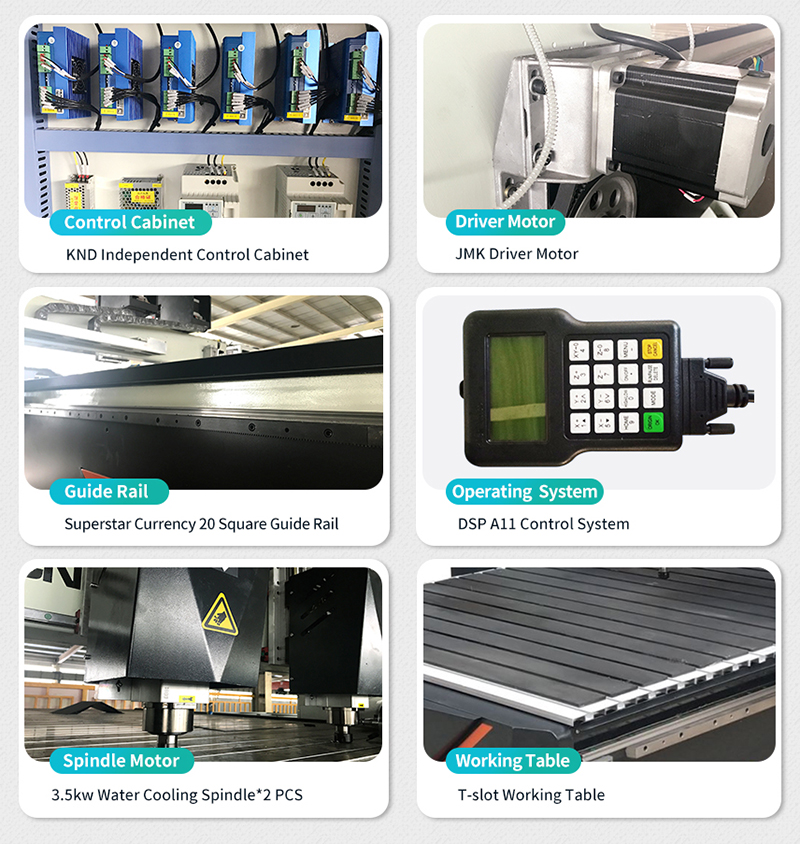 La macchina per incidere a doppia testa viene utilizzata principalmente nella produzione dell'industria del legno e nell'industria della decorazione pubblicitaria. Il letto è saldato con acciaio quadrato a pareti spesse, che è più stabile dei normali tubi quadrati. Il portale a vassoio adotta una struttura saldata in acciaio quadrato e la piastra laterale adotta una struttura in acciaio a pareti spesse, che riduce efficacemente le vibrazioni durante la lavorazione. Mandrino raffreddato ad acqua ad alta potenza, resistenza alle alte temperature, prolunga la durata del mandrino.
